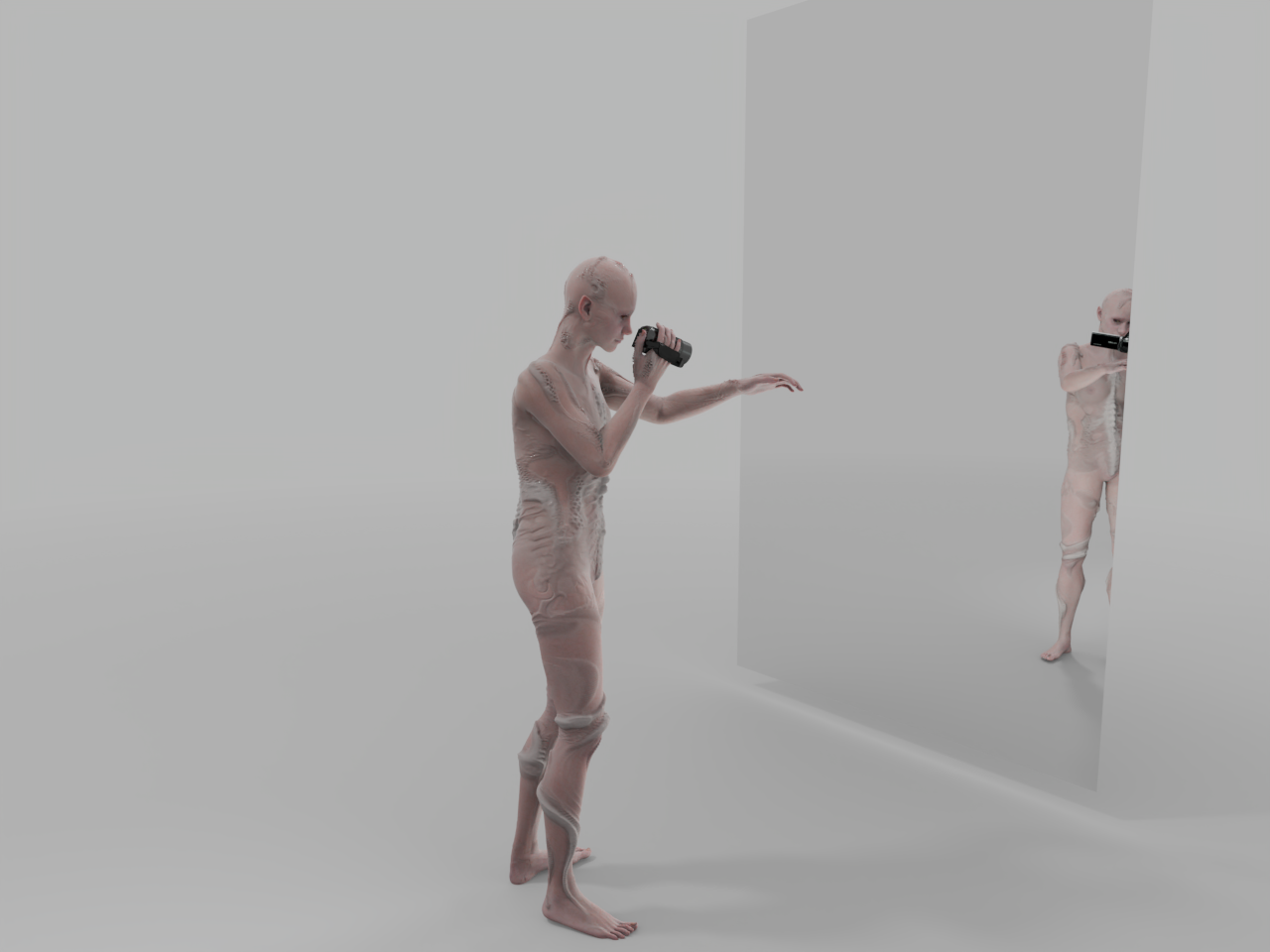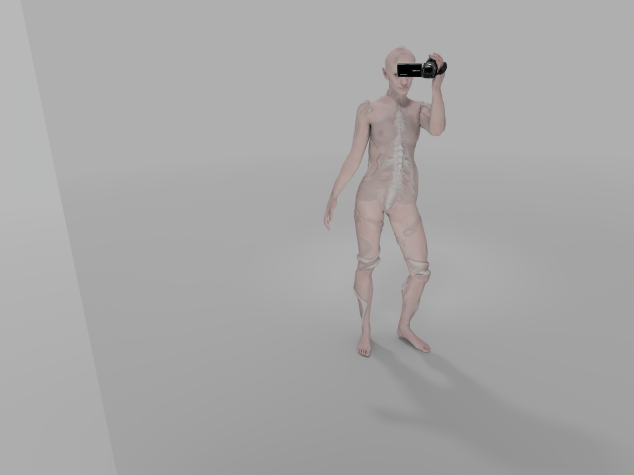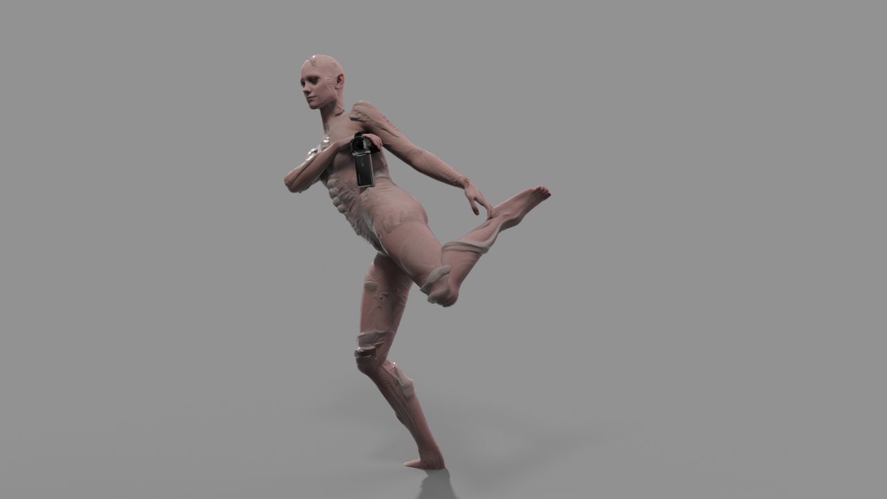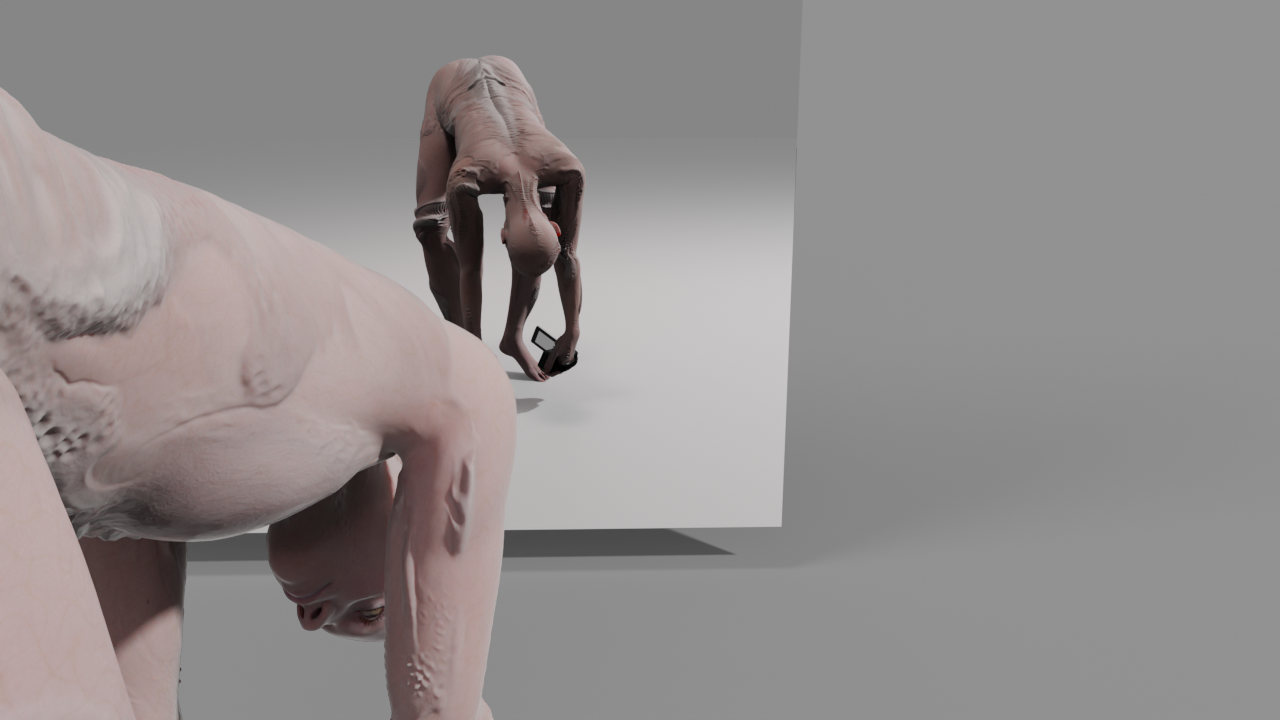 Interroform explores the horror of self-perception in mediated space. Emerging from experiments with DIY motion capture of performance and generative modelling techniques, brought together through animation in Blender, the work traces a digital body confronting its own image — an encounter that oscillates between curiosity and revulsion.